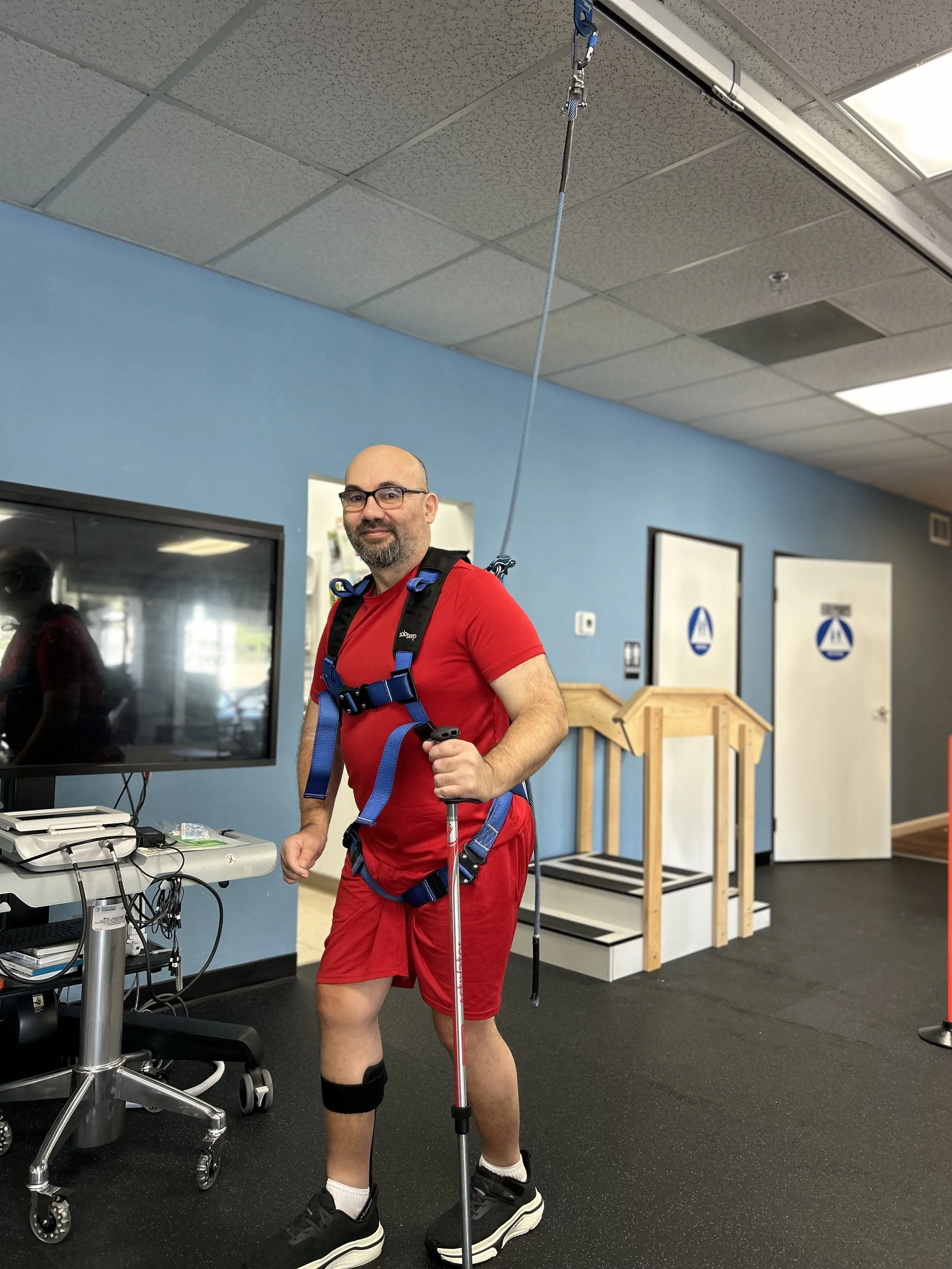 The Solo Step Overhead Track System is a ceiling mounted body-weight support system that improves safety during gait and balance training. This system allows our patients to practice walking and dynamic tasks without fall risk, allowing therapists to challenge them safely and promote more effective, intensive rehabilitation.