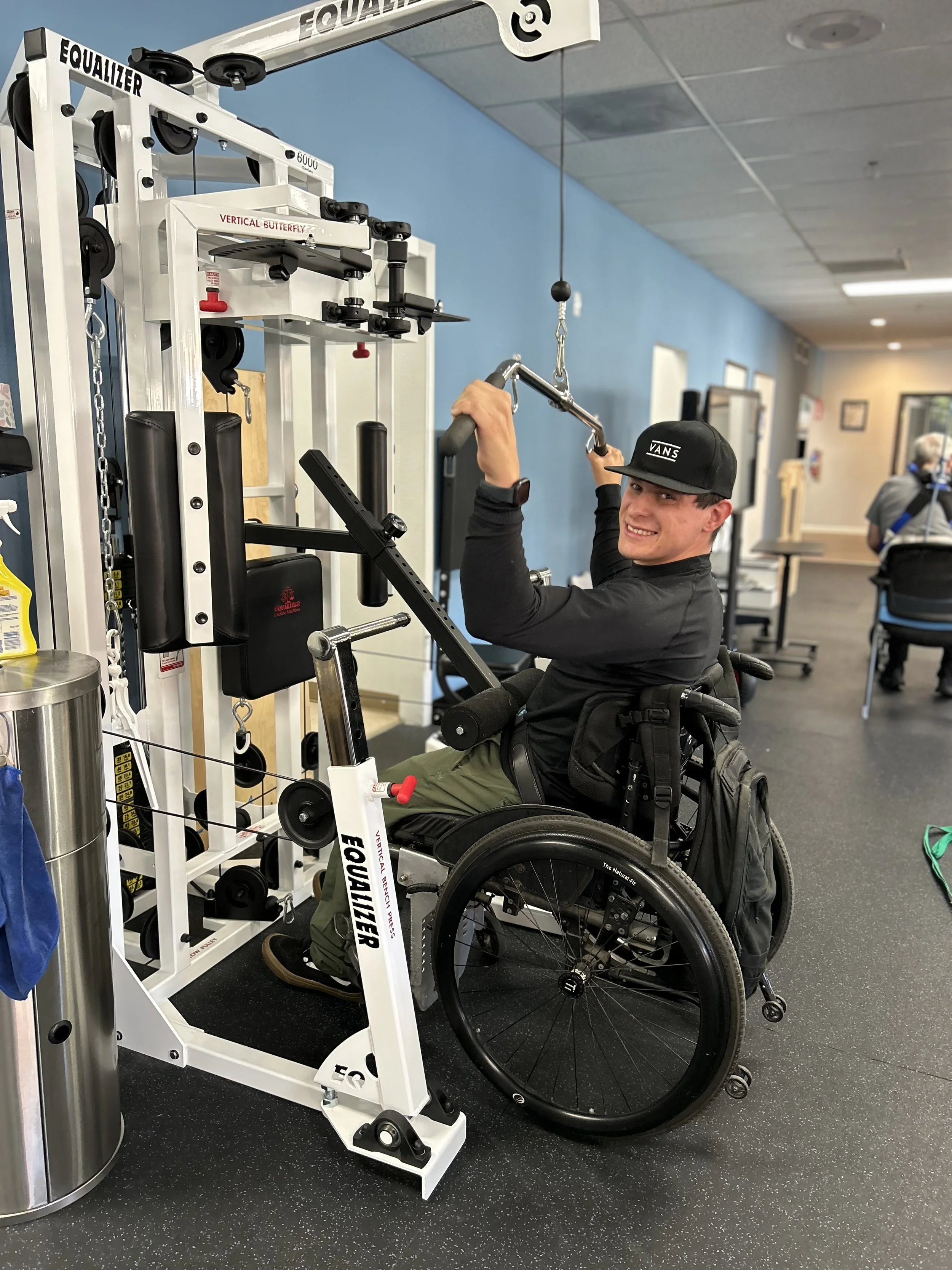 The Equalizer Strength Training System is an adaptive multi-gym designed to make strength training accessible to wheelchair users and individuals with limited mobility. Its adjustable, wheelchair-accessible design allows users to perform upper-body exercises without needing to transfer out of their chair.