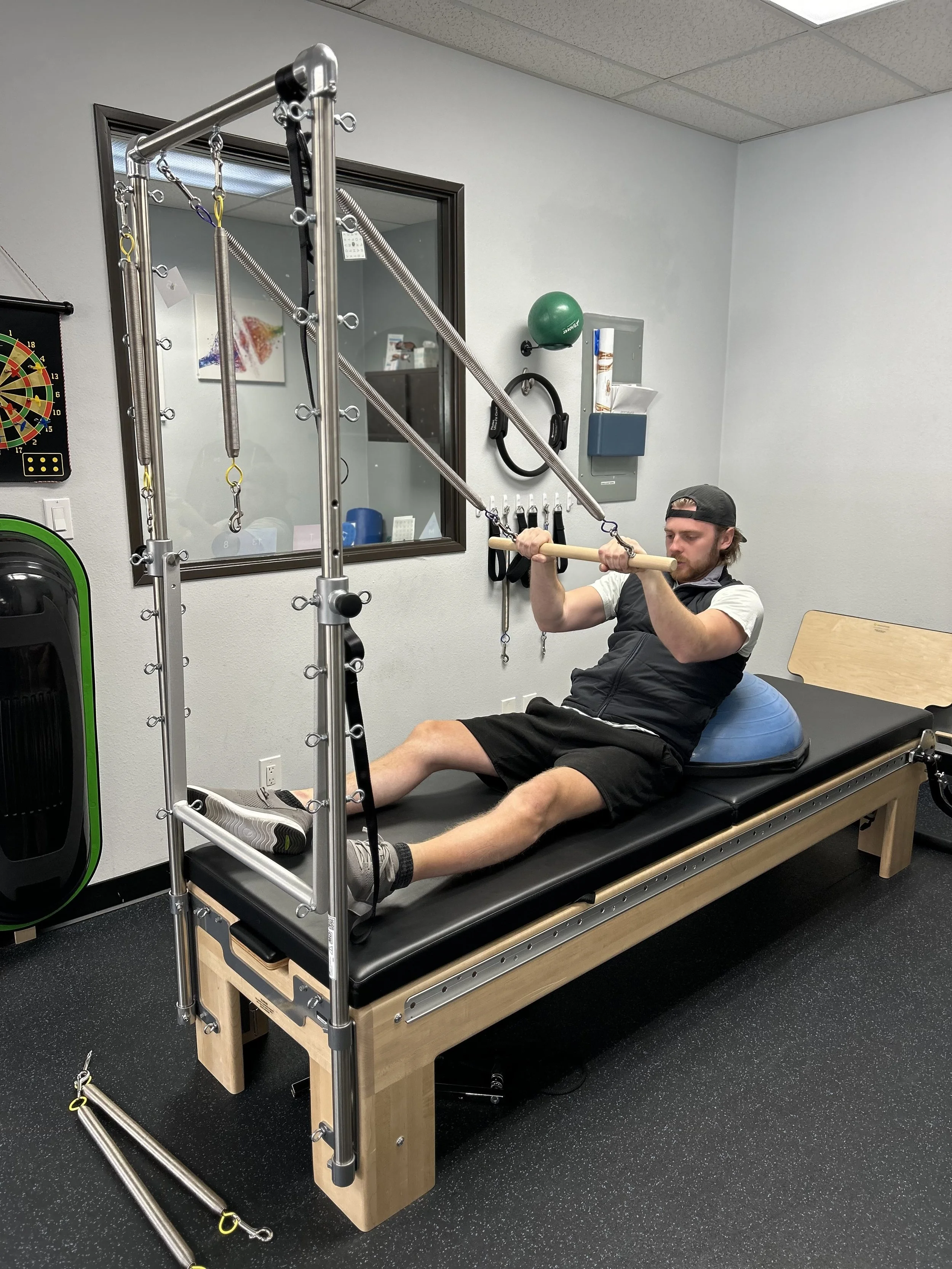 The Pilates Reformer and Tower provide adjustable, resistance-based movement training that supports controlled strengthening, flexibility, and core stability. In the clinic it allow patients to perform guided, low-impact exercises that improve alignment, balance, and functional movement while accommodating a wide range of mobility levels.