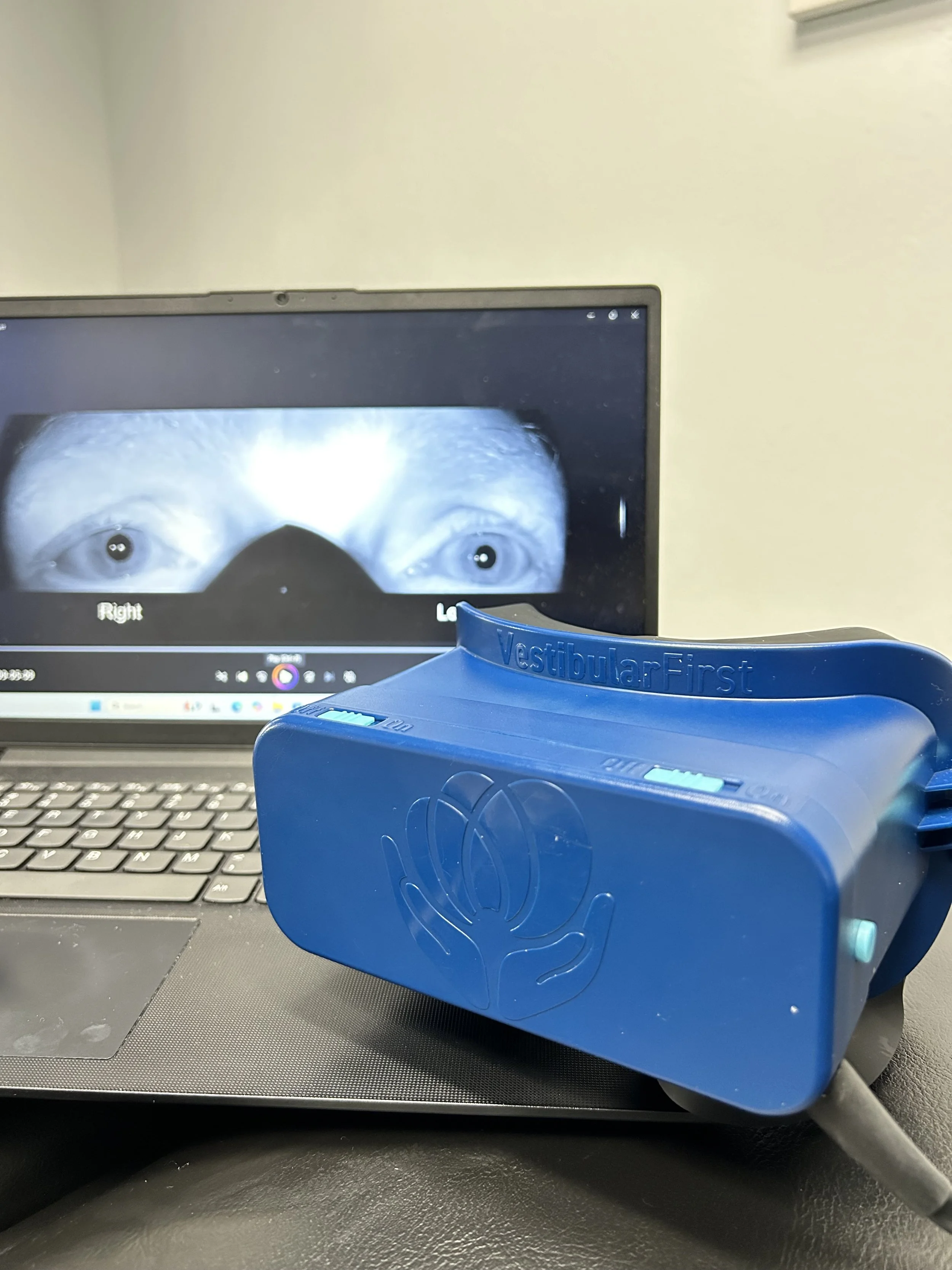 Vestibular First Infrared Goggles are specialized goggles that allow our therapists to observe eye movements using infrared technology. In the clinic they are used to assess and treat vestibular and balance disorders, helping therapists identify dysfunctions such as nystagmus or abnormal gaze responses and guide targeted vestibular rehabilitation.