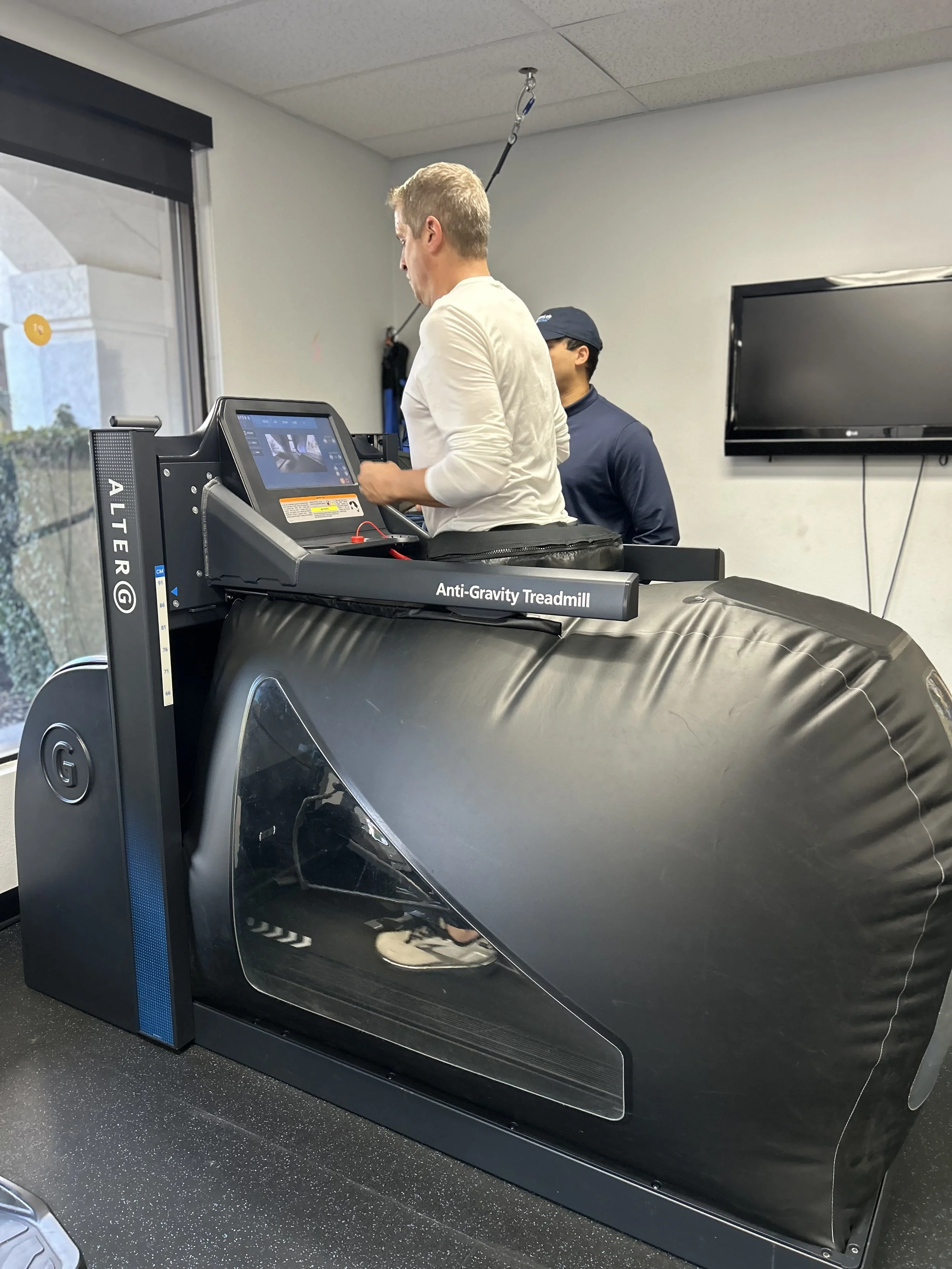 The AlterG treadmill uses differential air pressure to unweight the body, allowing patients to walk or run with reduced impact and greater safety. It helps individuals practice gait, build endurance, and improve movement quality while minimizing joint stress and fall risk
