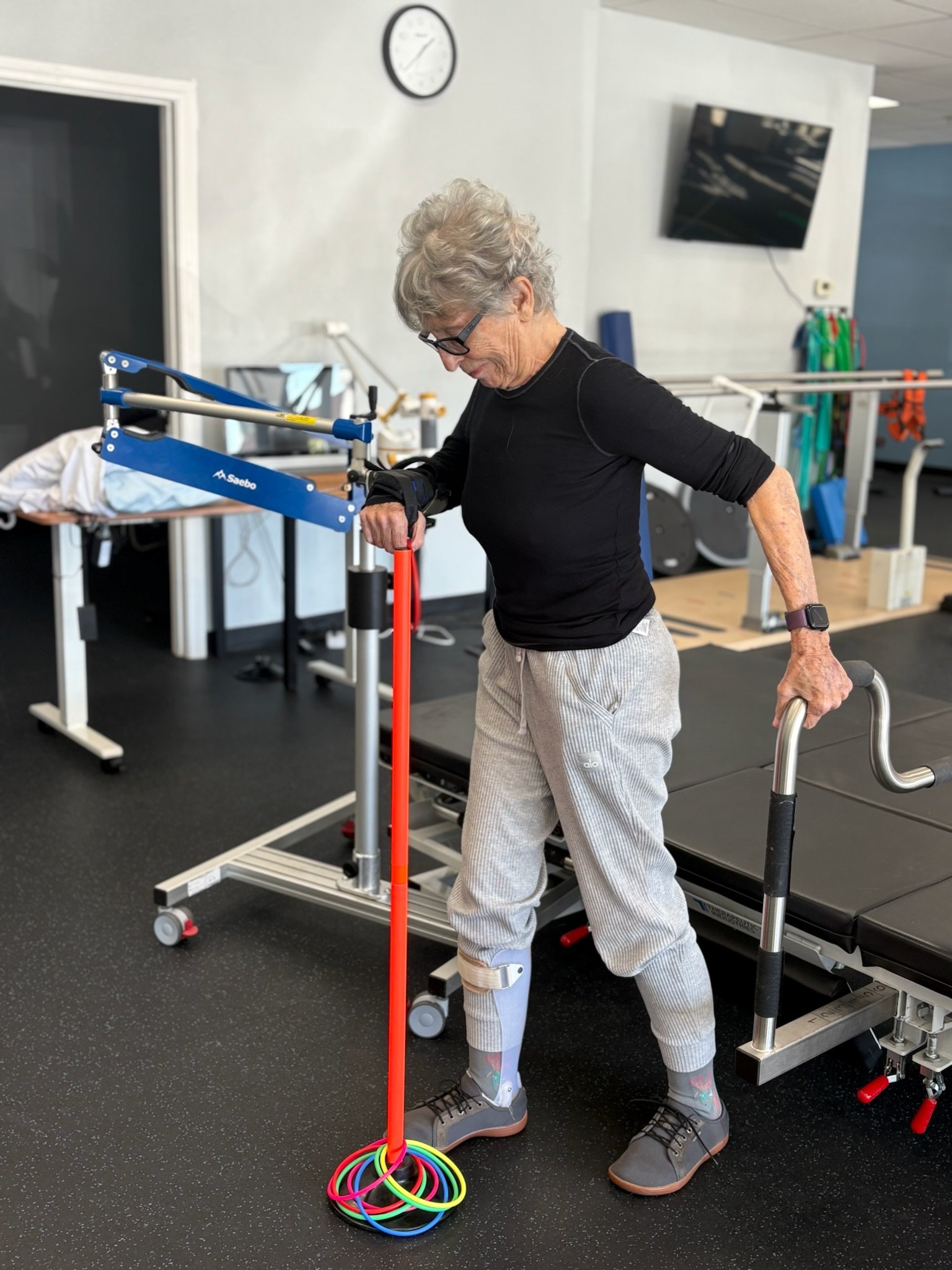 The Saebo Arm Support is a dynamic mobile arm support that reduces the effects of gravity, allowing patients with shoulder or arm weakness to move more freely during functional tasks. In the clinic it is used to help individuals practice reaching, grasping, and upper-extremity activities with improved control, promoting strength, motor relearning, and greater independence.